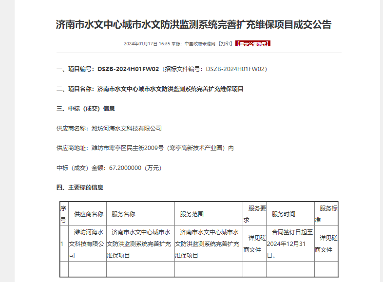 濟南市水文中心城市水文防洪監(jiān)測系統(tǒng)完善擴充維保項目,項目金額67.2萬元,主要服務(wù)內(nèi)容為濟南市城市水文防洪監(jiān)測系統(tǒng)完善擴充項目已建站點的日常運行維護、保養(yǎng)、檢修,保障自動測報設(shè)備正常運行,使信息化平臺更好服務(wù)于防汛監(jiān)測和指揮調(diào)度。